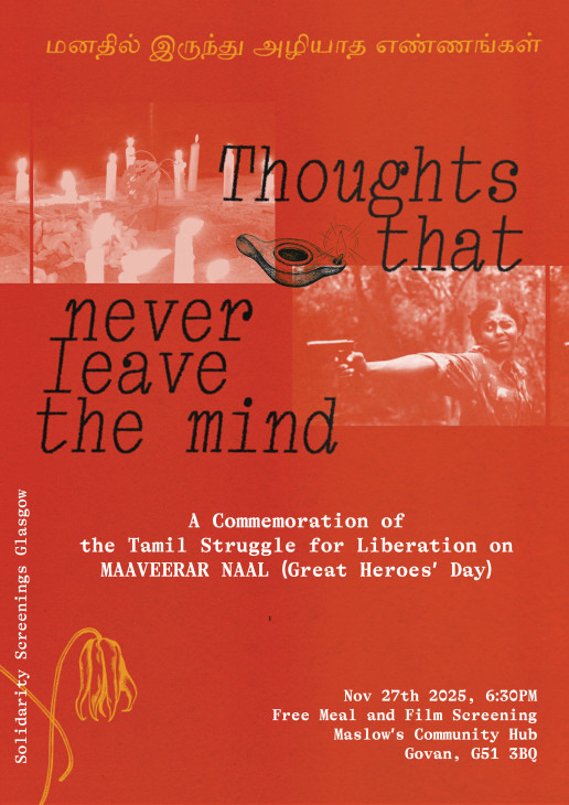 The event will raise funds for the families of martyrs, the funds will be split between families in Glasgow and in Eelam. As such, we recommend donations upon entry or when reserving your ticket. If you can’t make it but would like to donate, there is an option for this on Eventbrite. As always, no one will be turned away for lack of funds.